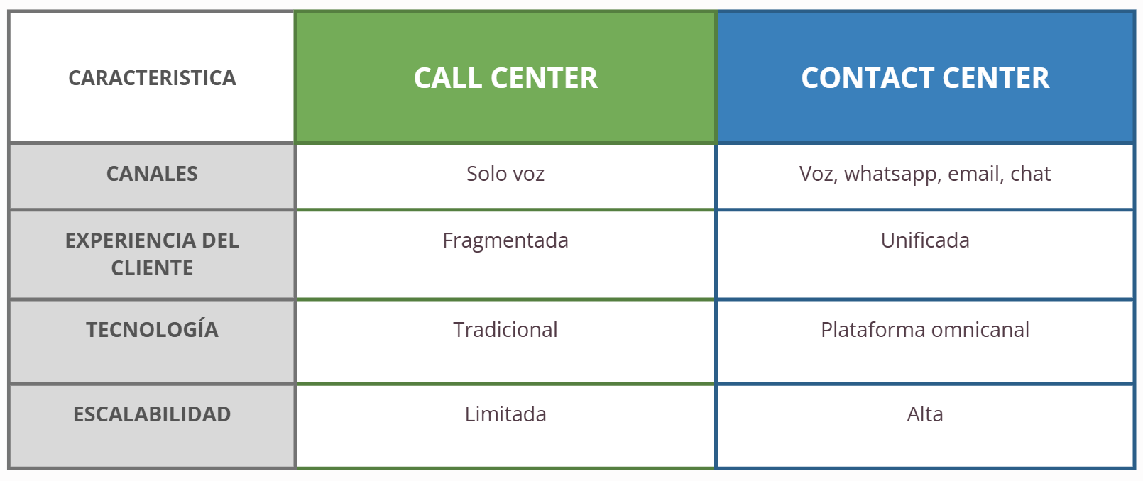 Un call center se enfoca exclusivamente en llamadas telefónicas entrantes y salientes. Su alcance es limitado y no contempla otros canales digitales.
